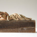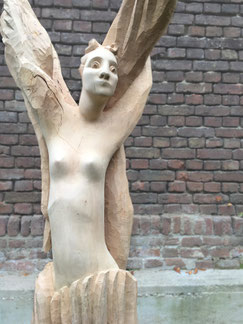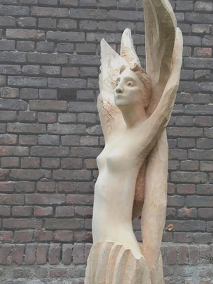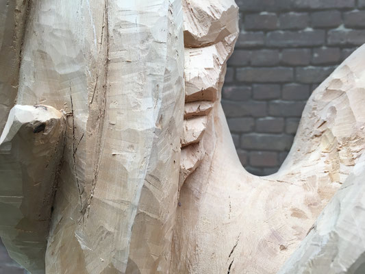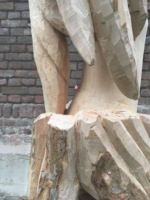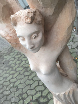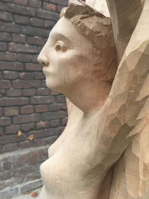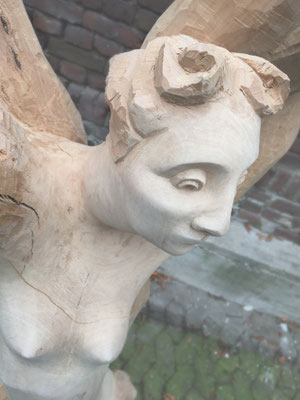 Wegen der Drehung des Stammes habe ich mich für einen weiblichen Körper entschieden, da dieser in meiner Auffassung die Bewegung eher verdeutlicht als ein männlicher. Die Figur sollte auch etwas Tänzerisches haben. Der Kopf und die Kopfhaltung sind eher abstrakt aufgefasst als der Oberkörper, aus dem die Flügel wachsen.