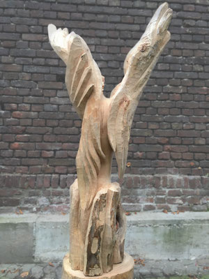 Die Besitzer einer alten Obstwiese in der Eifel beauftragten mich, aus dem über hundertjährigen gefällten Birnbaum eine Engelsskulptur, einen Seraph, zu schlagen.