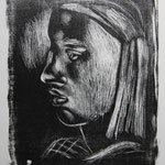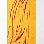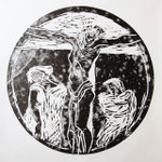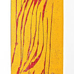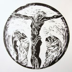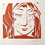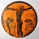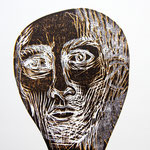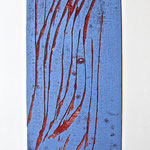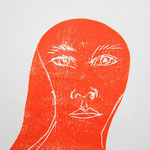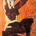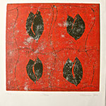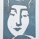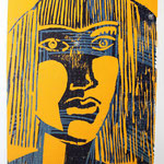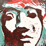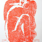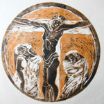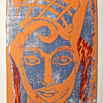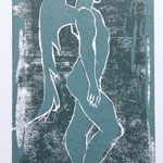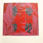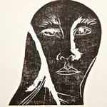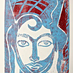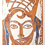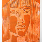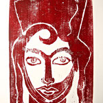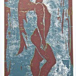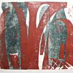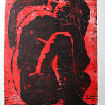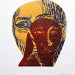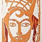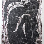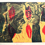 Beim Holzschnitt - der Hochdrucktechnik - werden die Platten einem Prozess unterzogen, der mir eine große gestalterische Möglichkeit gibt. Indem ich die Holzplatte reduziere und einzelne Partien stehen lasse, kommen die Figuren zum Vorschein. Oft verwende ich eine zweite Platte, die z.B. ein Blüten- oder Blattornament hat, um durch das Überdrucken beider Platten eine gesteigerte Wirkung zu erzielen. Das Schneiden in die Holzplatte, das "Wegnehmen", ist dem Bearbeiten von Baumstücken verwandt. Farben und Kontraste können den Ausdruck steigern; der flächige Farbauftrag grenzt den Druck von der Malerei ab.