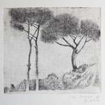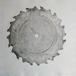 Als Tiefdrucktechnik habe ich diese vor den beiden anderen bereits im Studium kennen gelernt. Die Suche nach Bildthemen, nach der eigenen Sprache habe ich auch mit Hilfe der Radierung unternommen; dabei unterstützt die Seitenverkehrung des auf die Zinkplatte gezeichneten Themas, die Verfremdung durch den Druck, die kritische Haltung gegenüber der eigenen Arbeit, die zu einem Urteil führt. Die Schönheit der verletzten Metalloberfläche eines Kreissägenblattes z.B., das Abstrakte, ließ sich mit Hilfe der Radierung deutlich hervorheben.